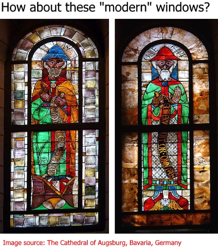 "The Prophet Windows in the Cathedral date from the late eleventh century - their luminosity, bright coloration and flat, two dimensional figures, which no doubt signalled their medieval status then, seem strangely modern to the twenty-first century eye." (Ref. 38 page 92)